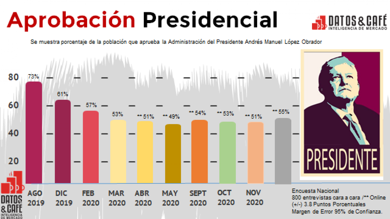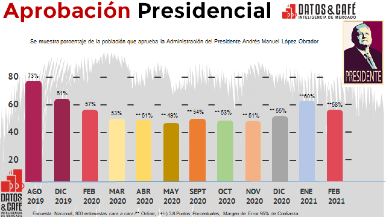 En marzo de 2021 la aprobación Presidencial mejora respecto al mismo periodo de 2020, incrementa 4%..
